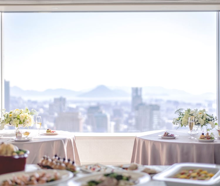 From our Sky Banquet Floor, you can enjoy breathtaking views of the Hiroshima cityscape, the distant islands of the Seto Inland Sea, and the scenic nature of mountain ranges and the World Heritage site of Miyajima. The ever-changing scenery creates a special ambiance for our guests.